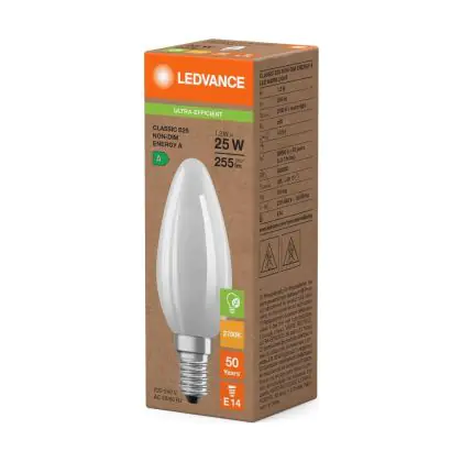 Cette ampoule rétro Ledvance LED Classic E14 Bougie Filament Dépolie 1.2W 255lm - 827 | Remplacement 25W est l’alternative idéale pour la remplacement de votre ampoule classique de 25 W. La technologie LED intégrée vous offrira de nombreux avantages. Les ampoules à incandescence traditionnelles ont une durée de vie limitée. Cette alternative LED vous permettra de profiter d’un éclairage durable et fiable.