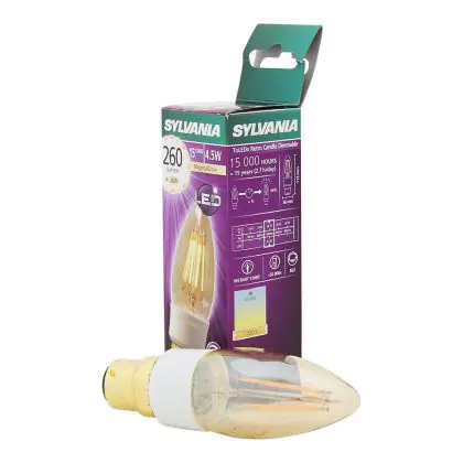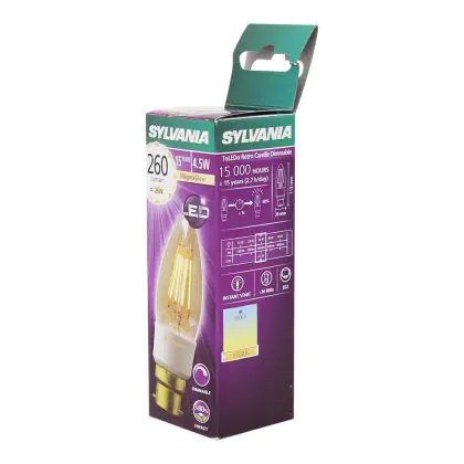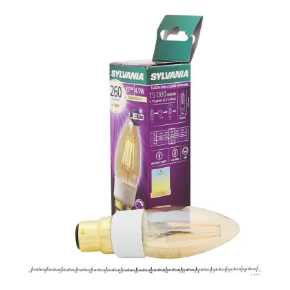 Cette ampoule Sylvania ToLEDo B22 Bougie Filament Dorée 4.5W 260lm - 817 Magmaglow | Remplacement 40W avec son efficacité lumineuse de lumen par watt vous permettra de profiter d’un éclairage de qualité. Avec sa durée de vie de 40000 heures, vous n’aurez pas à vous soucier de son remplacement avant quelques années.